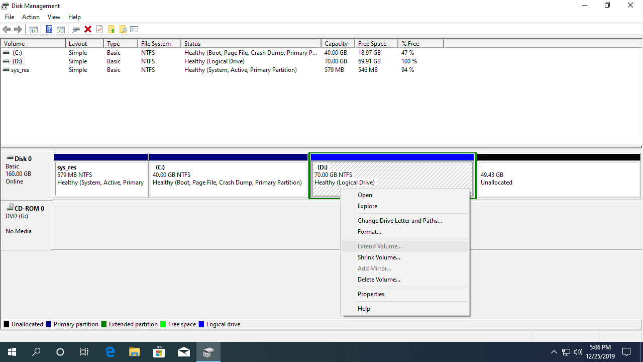 - Extend Volume greyed out for E drive, because Unallocated space is on the left side of it.