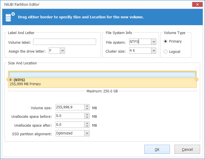 After shrinking a partition to get Unallocated space, you may create more volumes or add this Unallocated space to other partition on the same disk. To create more partitions, right click the Unallocated space and select "Create Volume". You can select partition type, file system, cluster size, add/modify partition label, change drive letter and edit partition size/location in the pop-up window.