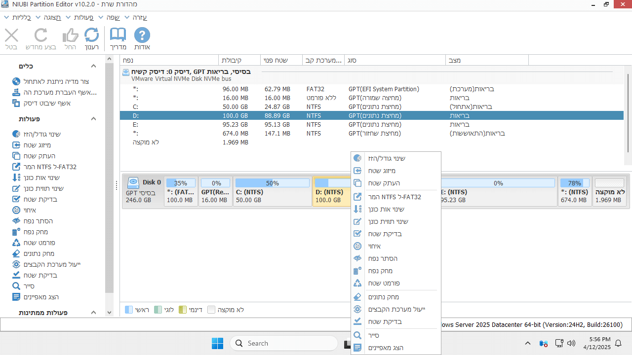 NIUBI Partition Editor מהדורת שרת היא תוכנת מחיצות דיסק אמינה עבור Windows Server, המיועדת לארגונים קטנים ובינוניים. היא עוזרת לך לכווץ, להרחיב, להעביר ולמזג מחיצות כדי לשנות את גודל המחיצות המוקצות מבלי לאבד נתונים. שכפל מחיצות דיסק כדי לגבות או להעביר את המערכת והנתונים ללא הפרעה לשרת. המר סוגי מחיצות דיסק, צור, מחק, פרמט, נגב וטייב מחיצות, בין שאר התכונות.