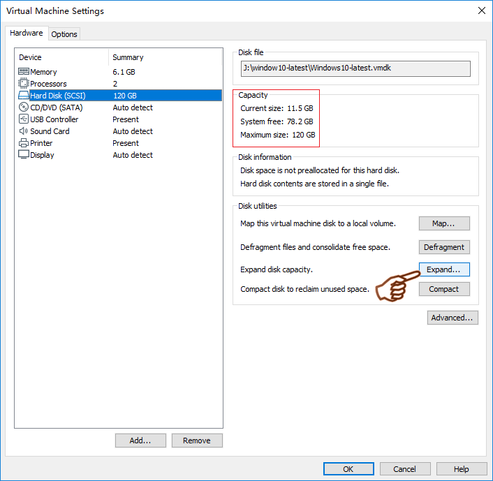 How to expand disk in VMware Workstation via wizard