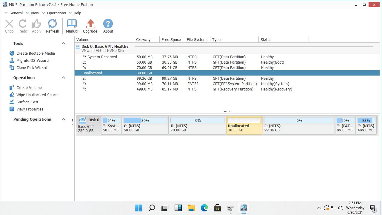 Download NIUBI Partition Editor free edition, you'll see all disks with partition layout and other information on the main window. In my computer, there's 30GB unallocated space which is shrunk from D: drive.