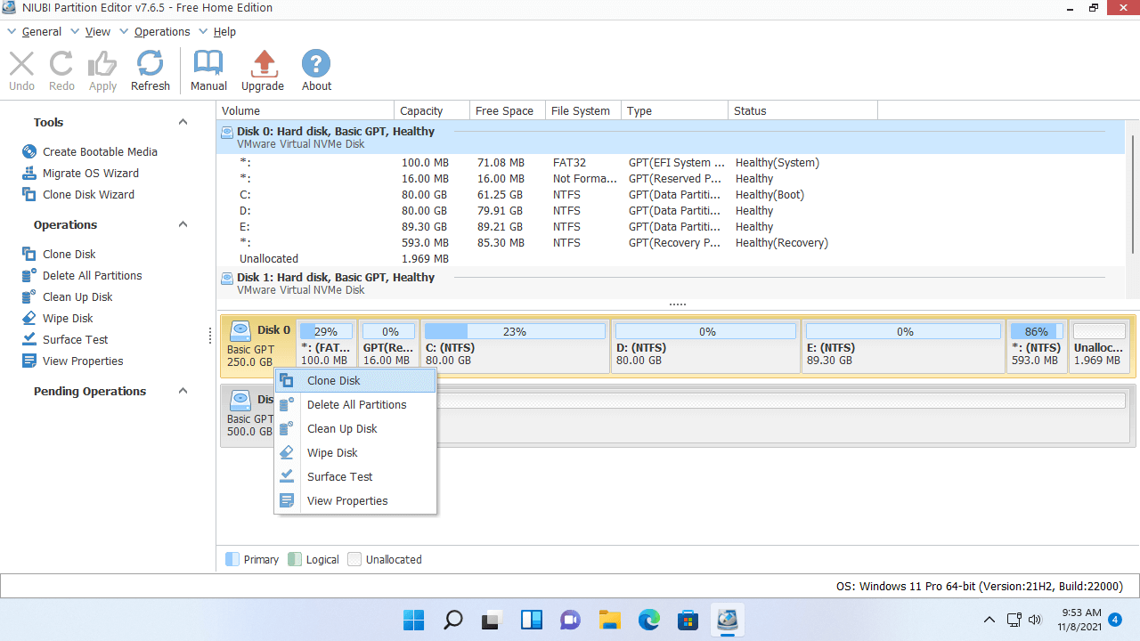 NIUBI Partition Editor uses the fast file system level copy method and it has advanced file-moving algorithm. It helps move and copy partition 30% to 300% faster than other similar tools. Besides clone disk partition in Windows 11, it has the ability to shrink, extend, move, merge, convert, defrag, wipe, hide partition, scan bad sectors, optimize file system, etc. It has free edition for Windows 11/10/8/7/Vista/XP home computer users.