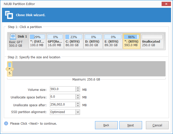 - Select the Unallocated space in destination disk and click Next.
