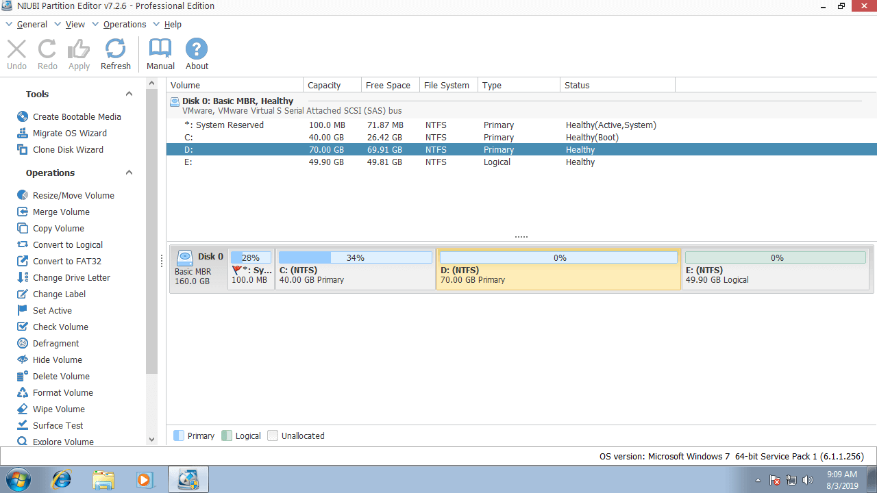 Download NIUBI Partition Editor, you'll see the main window with disk partition structure and other information. In my test computer, there are drive C, D, E and a system reserved partition in Disk 0.