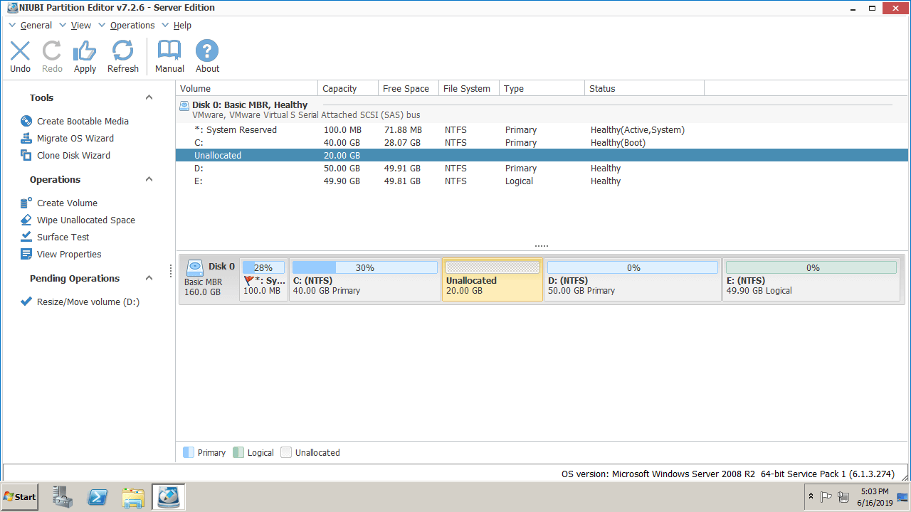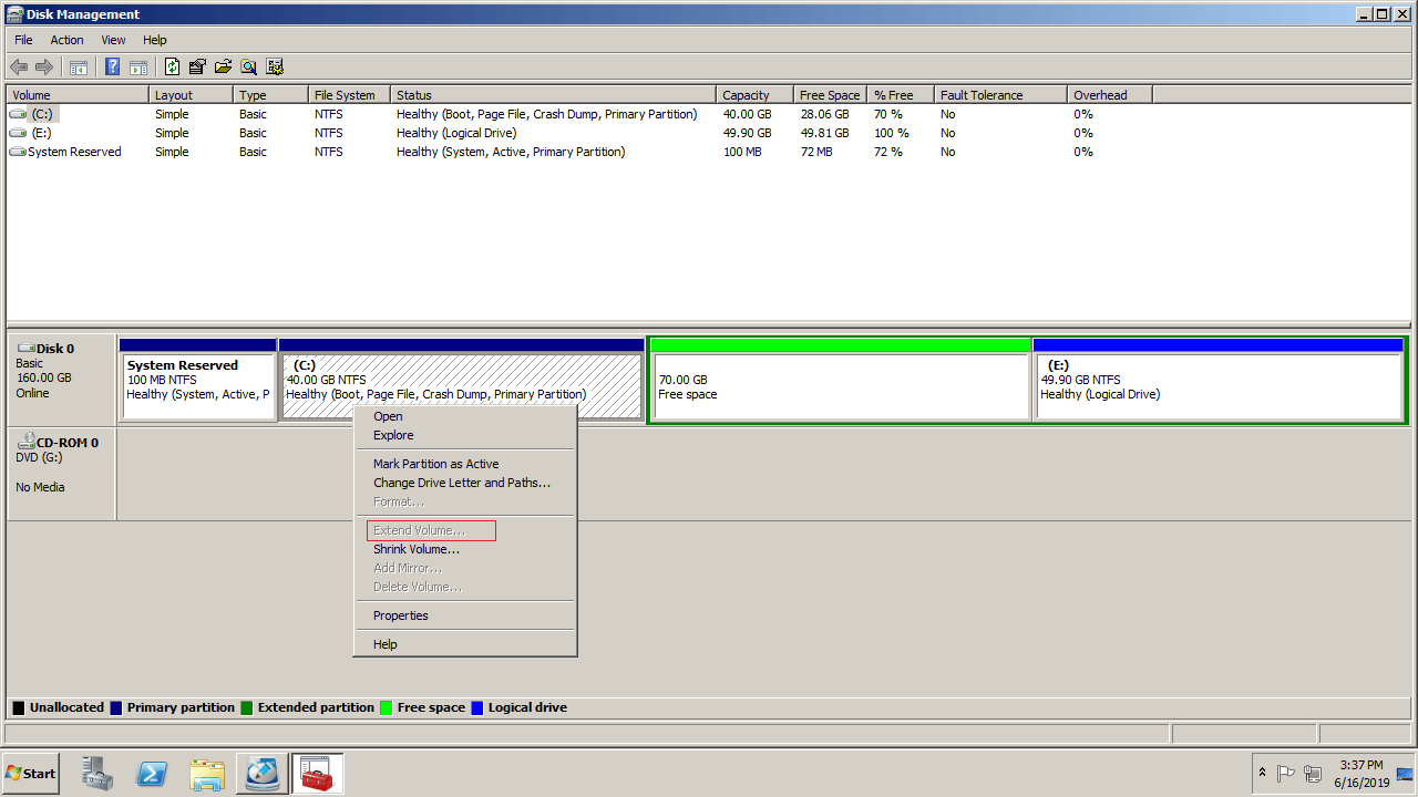What to do when you are unable to extend volume in Server 2008 R2