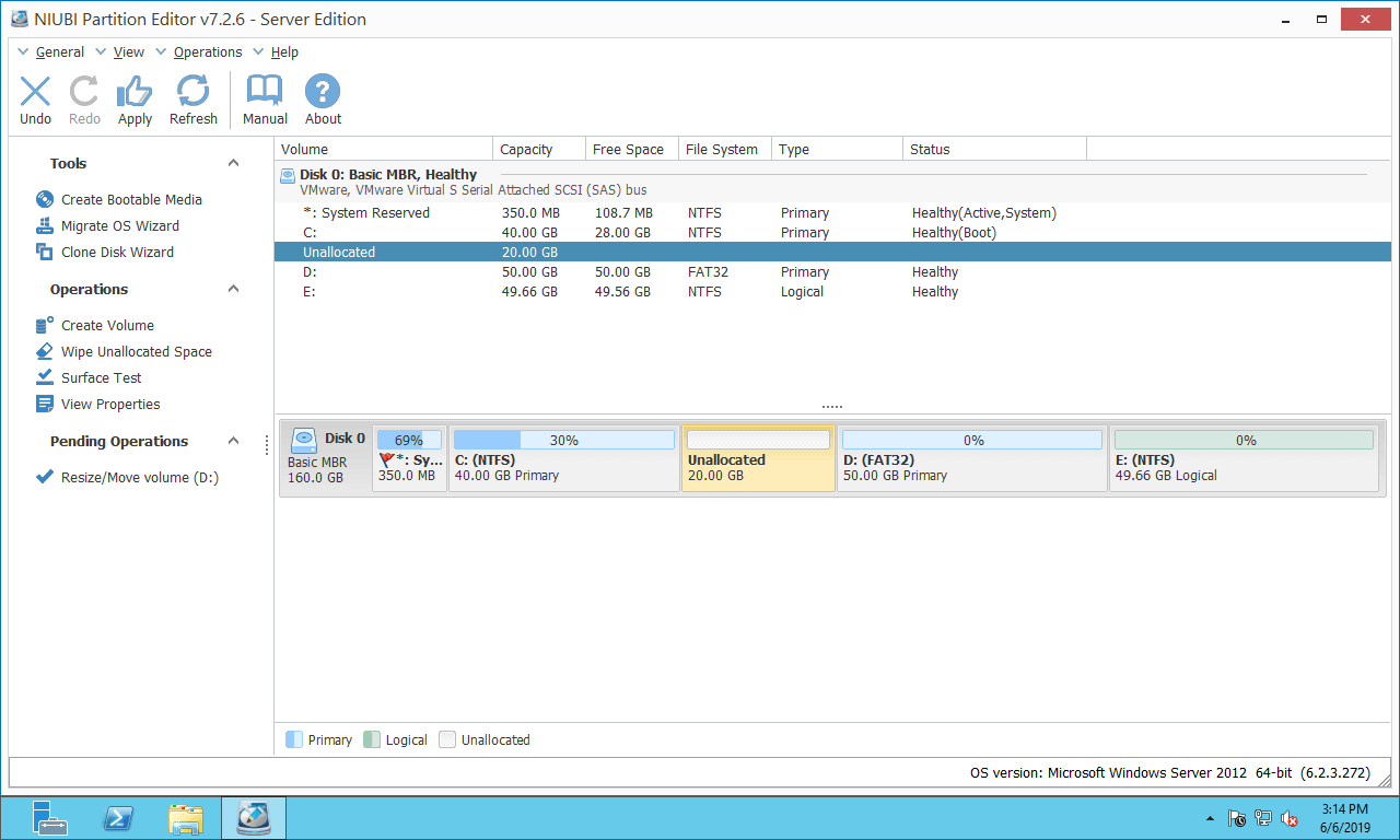 Besides moving and merging unallocated space in Windows Server 2012/2016/2019/2022/2003/2008, NIUBI Partition Editor helps you copy, merge, convert, defrag, scan, hide, wipe partition and much more.