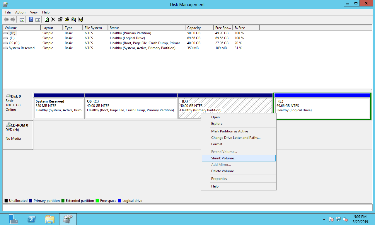 How to shrink partition in Windows 2012 Server to extend other volume: