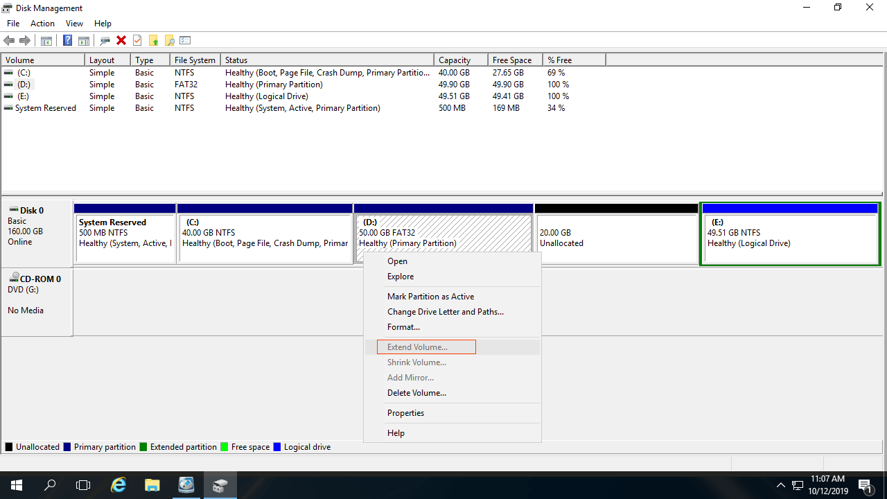 As you see in the screenshot, after shrunk D: drive, I got 20GB unallocated space on the right of D. This space is non-adjacent to C drive and is on the left of E, so Extend Volume is disabled for both partitions.