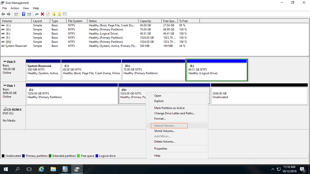 Steps when you can't extend volume in Windows Server 2016 after shrinking: