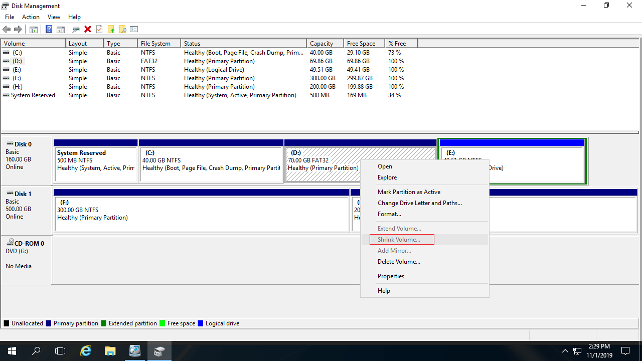 In fact, only the partitions that are formatted with NTFS or without any file system (RAW) can be shrunk in Disk Management. As you see in the screenshot, drive D is a FAT32 partition, so Shrink Volume is grayed out. In this case, server disk partition software is needed.