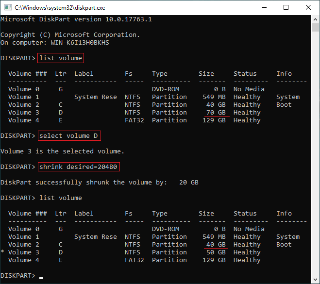 Run list volume again, as you see, drive D is shrunk from 70GB to 50GB.
