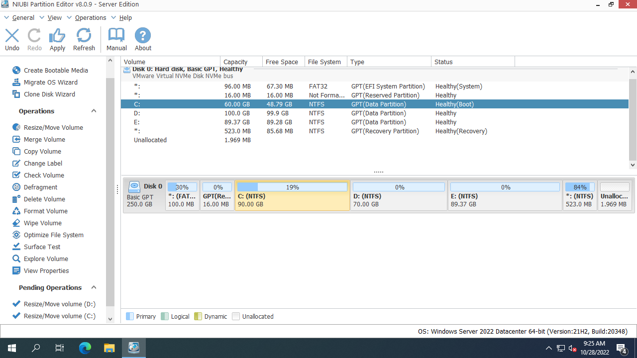 Besides shrinking, moving and extending partitions in Windows Server 2022/2025 and previous Server 2019/2016/2012/2008/2003, NIUBI Partition Editor helps you do many other disk partition management operations.